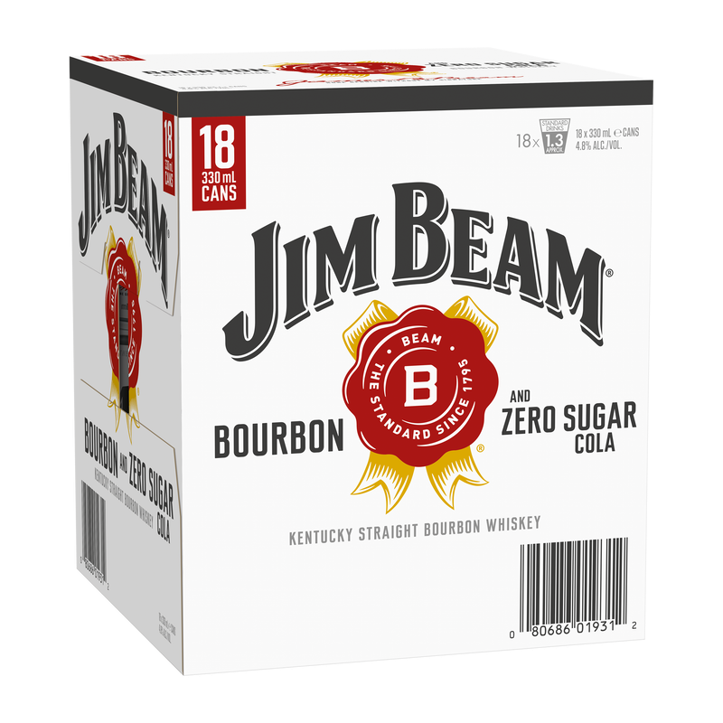 All the flavour, none of the sugar. Jim Beam & Cola Zero Sugar 4.8% delivers the signature smoothness of Jim Beam Kentucky Straight Bourbon Whiskey paired with a crisp, refreshing zero-sugar cola.